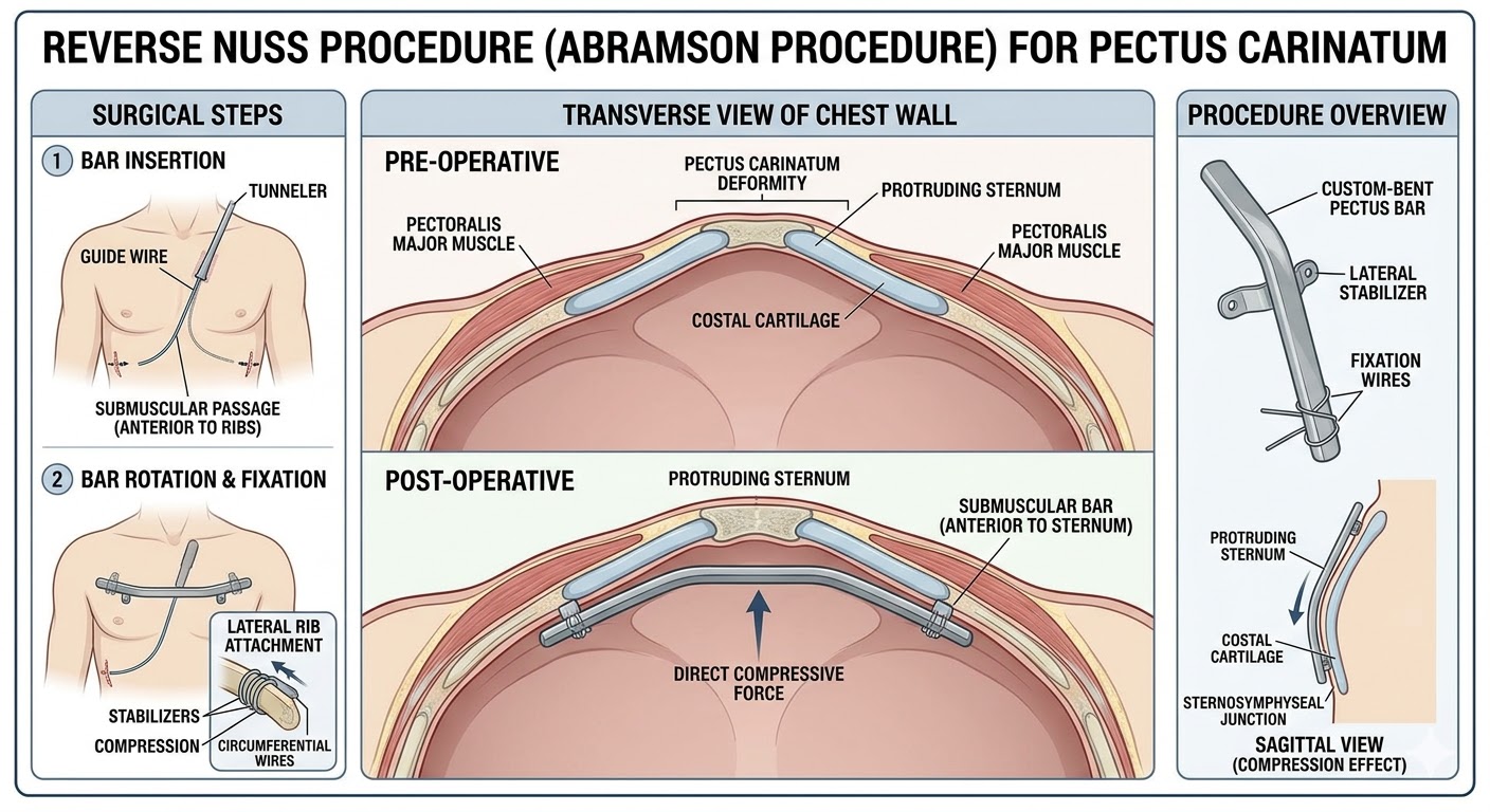 The Abraham or Reverse-Nuss procedure is done for severe cases of pectus carinatum, a chest deformity categorised by a defect in the chest that causes the breastbone to protrude from the chest. The conditions are often called pigeon chest since the bulging gives the chest a birdlike appearance.